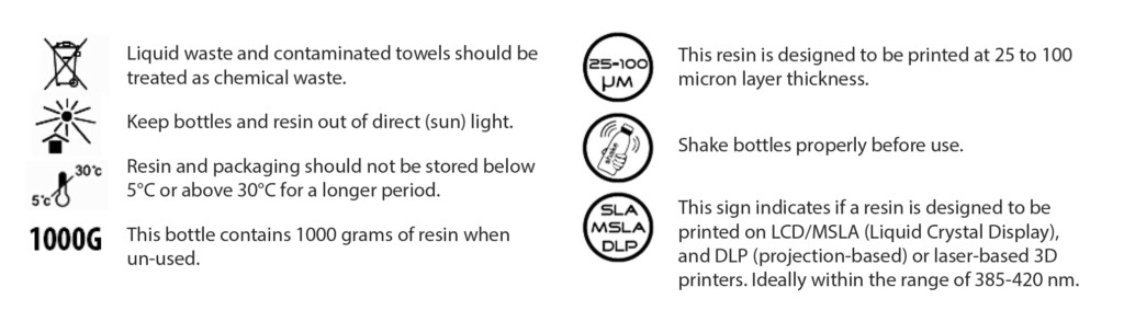 Shake the bottle for at least 1 minute before use. After shaking leave the resin to rest for 10 minutes to let air bubbles escape. The resin can be poured back into the bottle after use. Check the resin for residual pieces of polymer before pouring back the resin in the bottle.