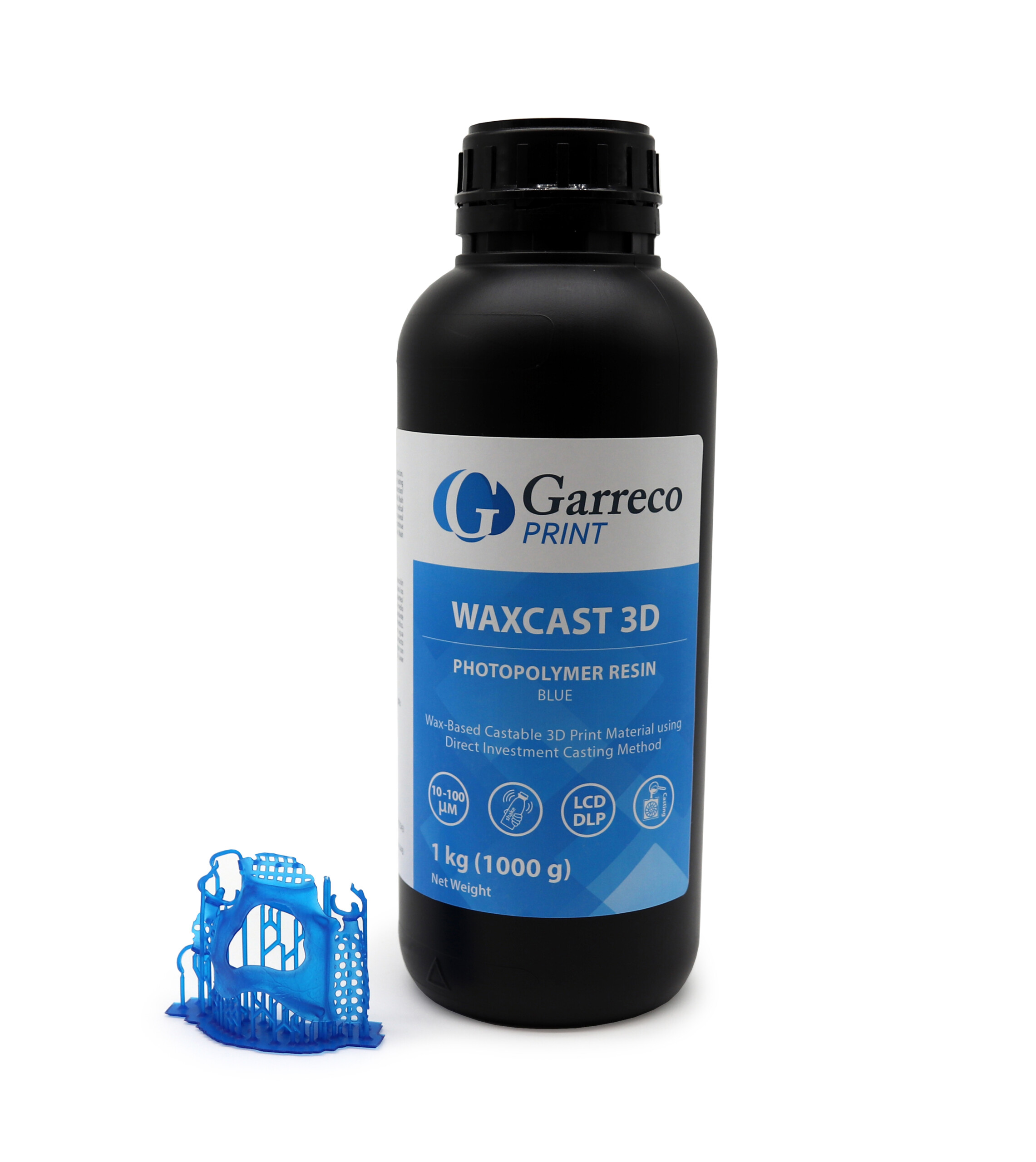 A wax-based Castable resin for Digital Light Processing (DLP), Liquid Crystal Display (LCD), and laser-based 3D printers. WaxCast 3D from Garreco Print is perfect for manufacturing dental, jewelry, and industrial parts using direct investment casting.